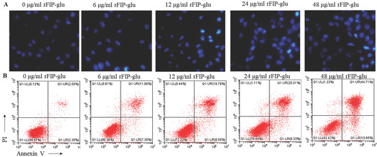 The B16 cells were treated with different concentrations of rFIP-glu (0, 6, 12, 24, 48 μg/mL) for 24 h, and washed with PBS and then stained with Hoechst 33258 for 30 min. After that, the cells were observed under a fluorescence microscope (Olympus, Tokyo, Japan), with an emission wavelength of 460 nm and an excitation wavelength of 350 nm.