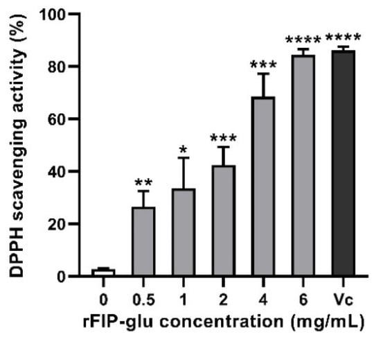 The effect of rFIP-glu on the scavenging rate of DPPH radicals. Vc (0.5 mg/mL) was used as the positive control. Data are expressed as means ± SD (n = 3). p > 0.05; *, p ≤ 0.05; **, p ≤ 0.01; ***, p ≤ 0.001; ****, p ≤ 0.0001 versus the control group.