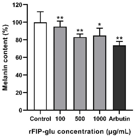 Effect of rFIP-glu on the melanin content of B16 cells. Arbutin (100 μg/mL) was used as the positive control. Data are expressed as means ± SD (n = 3). *, p ≤ 0.05; **, p ≤ 0.01 versus the control group.