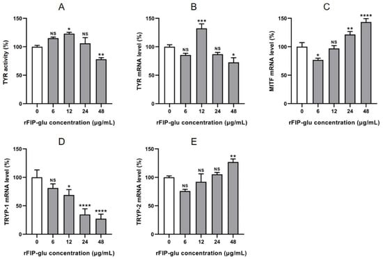 The effects of rFIP-glu on tyrosinase activity and mRNA expression of related genes in B16 cells. Tyrosinase activity (A); mRNA expression of TYR (B), MITF (C), TYRP-1 (D), and TYRP-2 (E). Data are expressed as means ± SD (n = 3). NS, p > 0.05; *, p ≤ 0.05; **, p ≤ 0.01; ***, p ≤ 0.001; ****, and p ≤ 0.0001 versus the control group.