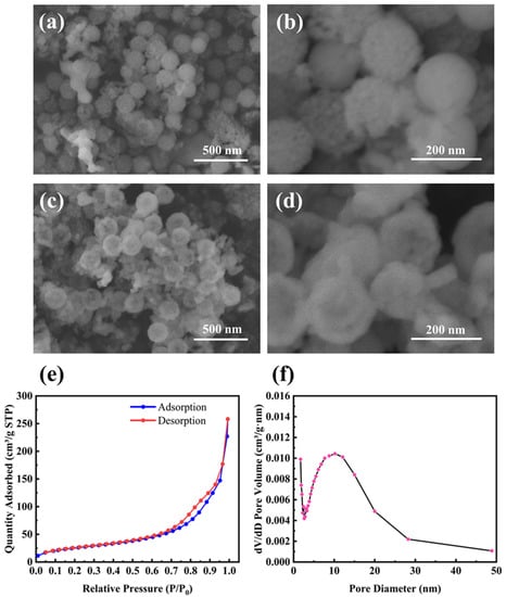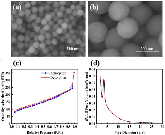 The morphology of M-SiO2 is shown in Figure 1a,b. It is clear that M-SiO2 exhibits a porous spherical structure with an average diameter of about 160 nm and a uniform size distribution. The porous properties of M-SiO2 were further investigated by the N2 adsorption/desorption isotherm, as shown in Figure 1c. The presence of an isothermal hysteresis loop was observed, which, in conjunction with the pore size distribution from 2 to 20 nm in Figure 1d, provides evidence for the presence of mesopores. The measured BET surface area was 371.7 m2 g−1, and the average pore size calculated by the BJH method was 7 nm. It should be noted that the pore size distribution shows only a narrow peak, indicating that the products are well-dispersed and do not show significant particle gaps resulting from the stacking of nanoparticles.