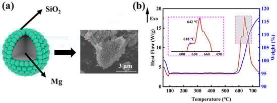 (a) The ideal micro-encapsulation structure between Mg powders and M-SiO2 and the corresponding SEM image; (b) the TG–DSC curve of the magnesiothermic reduction reaction in an argon atmosphere at a ramp-up rate of 10 °C min−1.