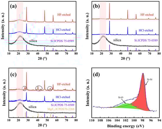 The XRD patterns of the reaction process products at different temperatures and mixing methods: (a) M-Si calcined at 660 °C in Ar after ball milling; (b) M-Si calcined at 700 °C in Ar after ball milling; (c) M-Si calcined at 700 °C in Ar after manual mixing. In addition, (d) the high-resolution XPS spectrum of Si 2p.