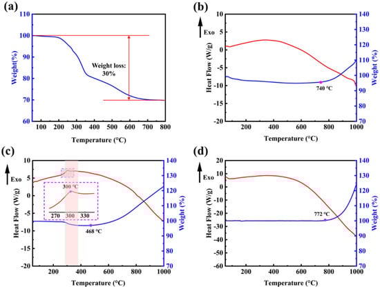 Figure 5c shows the TG–DSC curves of the newly prepared M-Si with NaCl as a heat absorber. In Figure 5c, M-Si shows a small exothermic peak at the low temperature section near 300 °C, which is consistent with previous reports in the literature []. At this temperature, it is thought that the Si–Hx bonds break and form Si dangling bonds and H2, as confirmed by the TG curve corresponding to a weight loss of 2%. The oxidation process indicated by weight gain begins almost immediately after the formation of a large number of Si dangling bonds, which are more sensitive to O2 molecules in air than the Si-saturated bonds of non-porous silicon nanopowders. In Figure 5d, it indicates that the commercially available silicon nanopowders started their oxidative reaction, indicated by weight gain, at 772 °C, while the temperature is 468 °C in Figure 5c. It is made possible by the large specific surface area and the rich reaction sites from the porous structure, which allows for better contact with the oxidizer.