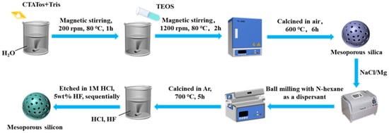 Firstly, M-SiO2 was added to an aqueous NaCl solution (13 wt%), where the mass of NaCl was six times that of M-SiO2, and the solution was sonicated for 30 min. Then, the mixture was stirred for 6 h and dried directly at 100 °C for 12 h. The products were mixed with Mg powders using a ball mill method at a mass ratio of M-SiO2:Mg = 1:0.8, and the mass ratio of balls to powders was set as 10:1. N-hexane was used as a dispersant in this process. For comparison, we also produced the mixtures by manual mixing. The resulting mixtures were heated in a furnace under an Ar atmosphere for reduction at controlled temperatures of 660 or 700 °C, and the reaction time was set at 5 h. After a reduction reaction, the by-products and residual SiO2 were removed by sequential etching with 1M HCl and 5 wt% HF. Finally, M-Si were obtained. Figure 6 shows a schematic diagram of the whole preparation process of M-Si.