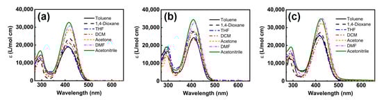 Figure 1 shows the UV-vis absorption spectra of the compounds in solvents with different polarities. Two absorption peaks can be observed for all three molecules at around 295 nm and in the range of 400–420 nm: the former was ascribed to the TPA-localized electronic π–π* transition [41,42], and the latter with a longer wavelength was due to the intramolecular charge transfer (ICT) resulting from electronic transition [43,44]. The absorption peak wavelength was barely shifted in the different solvents, indicating that the ground state charge transfer was hardly affected by the solvent polarity. Among the three molecules, p-DBCNPy showed the most redshifted absorption peak, which was due to the increased conjugation between the para-pyridine and the TPA-acrylonitrile part [30]. Specifically, p-DBCNPy had the largest absorption peak wavelength in THF (413 nm) in comparison to those of o-DBCNPy (408 nm) and m-DBCNPy (402 nm).