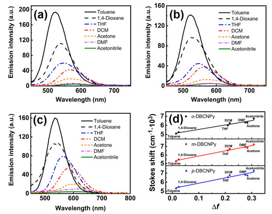 Fluorescence emission spectra of o-DBCNPy (a), m-DBCNPy (b), and p-DBCNPy (c) in 1 × 10−5 M solutions (THF, tetrahydrofuran; DCM, dichloromethane; DMF, N, N-dimethylformamide); the plot of Stokes shifts of the three isomers in different solvents versus solvent orientation polarizability (Δf) (d).