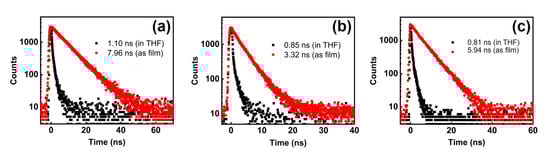 Fluorescence lifetimes of o-DBCNPy (a), m-DBCNPy (b), and p-DBCNPy (c) in THF and as neat film.