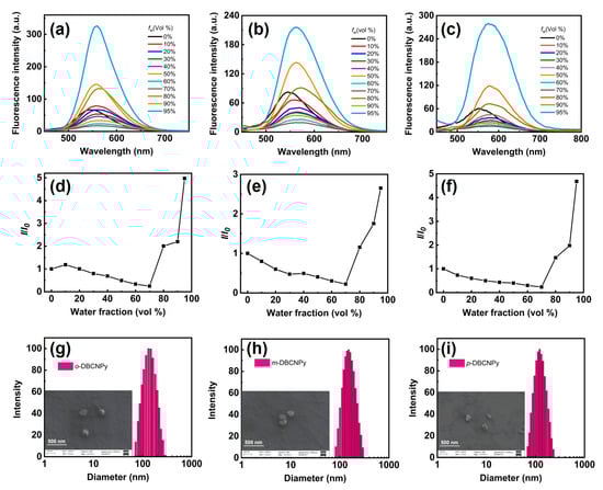 Fluorescence spectra, variation in relative emission intensity (I/I0), and emission maxima wavelength of o-DBCNPy (a,d), m-DBCNPy (b,e), and p-DBCNPy (c,f) in THF–water mixtures with increasing fw (concentration of compound: 1 × 10−5 M, λex = 415 nm); size distributions of o-DBCNPy (g), m-DBCNPy (h), and p-DBCNPy (i) aggregates in THF–water mixtures (fw = 95%) (insets are SEM images of the particles).