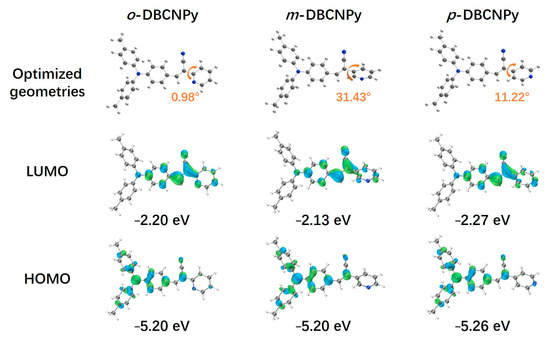 To gain insight into the molecular structures and the electronic properties of the DBCNPy isomers, density functional theory (DFT) calculations were performed with the Gaussian 09 program at the B3LYP/6-311g(d) basis set [52]. The optimized molecular geometries (Figure 5) revealed the different planarities of the isomers’ acceptor moieties. The torsion angle between the pyrimidine ring and the central -C=C-plane increased from 11.22° in p-DBCNPy to 31.43° in m-DBCNPy, which was presumably due to the repulsion between the cyano group and the lone-pair electrons on the meta-nitrogen atom. In o-DBCNPy, however, the torsion angle was decreased to only 0.98°. This could be attributed to the interaction between the ortho-nitrogen atom and the hydrogen on the vinyl group (-CH=C-) The torsion extent of the pyridine ring in the three isomers might partly explain the differences in their fluorescence properties: higher planarity between the imide and the pyridine led to elongated fluorescence lifetime and more intense fluorescence emission. In addition, the distributions of the frontier molecular orbitals are also depicted in Figure 5. The highest occupied molecular orbitals (HOMOs) and lowest unoccupied molecular orbitals (LUMOs) of the isomers were spatially separated, with the former mainly located on the TPA moiety and the latter distributed on the imide and pyridine part, demonstrating the D–A feature of the isomers [53].