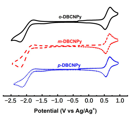 Cyclic voltammetry (CV) analysis was carried out and the CV curves of the fluorophores were recorded (Figure 6). The oxidation potential (Eox) of the three molecules from the quasi-reversible oxidation peak of the triphenylamine part were similar (0.60–0.62 V). The reduction potentials (Ered) showed a slight difference among the isomers, and were determined to be −1.98V, −2.01V, and −1.93V for o-DBCNPy, m-DBCNPy, and p-DBCNPy, respectively. Accordingly, the vertical ionization potential (IP) and the vertical electron affinity (EA) were estimated by the equations IP = 4.93 eV + Eox and EA = 4.93 eV + Ered [54,55], and the data are given in Table 3. The results indicate that the para-pyridine showed a stronger electron-accepting ability than the other two isomers. This is also in accordance with the results of the spectral analysis. Notably, the IP and EA values matched well with most of the hole- and electron-transporting materials, meaning that these isomers were energetically appropriate to be assembled into electroluminescence devices as emitting materials.