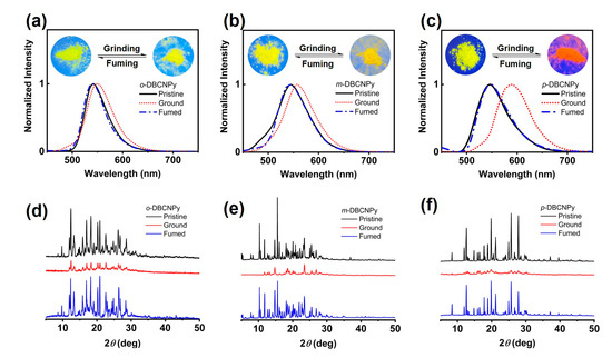 Considering that p-DBCNPy was relatively sensitive toward the stimulus of external force, the mechanofluorochromic (MFC) properties of the other two isomers were also investigated, and their emission spectra and powder X-ray diffraction (XRD) patterns at different states are demonstrated in Figure 7. Unfortunately, the MFC effect of o-DBCNPy and m-DBCNPy was not as prominent as that of p-DBCNPy. Although o-DBCNPy and m-DBCNPy showed good reversibility during grinding and solvent fuming, the wavelength changes were no more than 20 nm. This was probably due to a smaller change in the powder morphology under external force: partially losing their crystallinity instead of fully converting into an amorphous form [56]. After hard grinding, the XRD patterns of o-DBCNPy and m-DBCNPy retained some features of a microcrystalline structure, as shown in Figure 7d,e. Furthermore, the differential scanning calorimetry (DSC) curves (Figure S10) show only weak exothermic peaks at 93.5 °C for o-DBCNPy and 99.7 °C for m-DBCNPy, indicative of a smaller extent of the cold crystallization process than that of p-DBCNPy [57]. Meanwhile, although attempts were made to grow single crystals of o-DBCNPy and m-DBCNPy, the needle-like crispy microcrystals were unable to be analyzed by single-crystal X-ray diffraction. In comparison, p-DBCNPy easily formed well-ordered microcrystals or even single crystals through slow solvent evaporation, and the orderly arranged molecules transformed into an amorphous state upon grinding (Figure 7f). The results indicate that the substitution position of the pyridine ring could affect the crystallinity and MFC property of the molecule series.