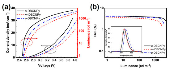 Non-doped organic light-emitting diode (OLED) devices based on the three molecules were fabricated due to their relatively high fluorescence quantum yields in solid state (film) and appropriate IPs and EAs. The devices were assembled based on the following configuration: ITO/MoO3 (hole injection layer, 3 nm)/TAPC (hole-transporting layer, 50 nm)/TCTA (exciton-blocking layer, 10 nm)/DBCNPy isomers (light-emitting layer, 25 nm)/TPBi (electron-transporting layer, 50 nm)/LiF (electron injection layer, 1 nm)/Al [58]. The electroluminescence (EL) characteristics of the devices are demonstrated in Figure 8, and the data are summarized in Table 4. All OLEDs emit green light with a brightness exceeding 2000 cd m2, and the light colors of the o-DBCNPy- and m-DBCNPy-based devices were close to pure green (color coordinates (0.21, 0.71)). The best electroluminescence performance was achieved by the device base on o-DBCNPy with a maximum current efficiency (CE), power efficiency (PE), and external quantum efficiency (EQE) of 18.95 cd A−1, 15.76 lm W−1, and 4.31%, respectively, and the color coordinates are (0.26, 0.70). By comparing the EL performances among the three devices, it was observed that the parameters (especially EQE) were roughly in accordance with the fluorescence quantum yields of the non-doped films (Φf,f). In terms of EQE, the o-DBCNPy-based device was among the best of the traditional fluorescent OLEDs based on cyanostilbene derivatives reported so far [59,60], including doped and non-doped devices. In addition, the EL performances and the structural modification feasibility made it possible to produce white OLEDs using the DBCNPy molecule series as the emitting materials.