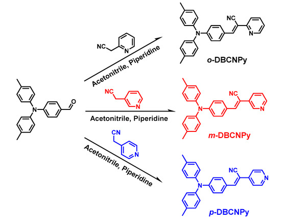 General synthetic method of the molecules. The target compounds were synthesized according to a previous report [57]. Briefly, 4-(di-p-tolylamino)benzaldehyde (1 equiv.) and (pyridin-2-yl)acetonitrile derivatives (1.2 equiv.) were dissolved in 20–30 mL acetonitrile, and a catalytic amount of piperidine (usually three drops per mmol of the reactant) was added into the solution. The reactant mixture was stirred at 85 °C for 8–10 h and was then filtered. The precipitate was rinsed with cold ethanol and recrystallized in a mixed solvent of cyclohexane and dichloromethane (10:1–15:1, v/v).