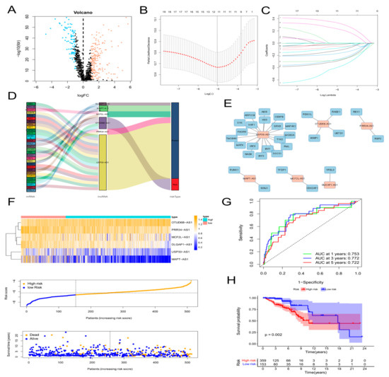 Construction of an aging-related lncRNA prognostic signature. (A) Volcano plot of differentially expressed lncRNAs in tumor samples and normal samples using the Pearson correlation analysis. Red dots represent up-regulated genes and blue dots represent down-regulated genes. (B,C) LASSO analysis to screen 20 prognostic aging-related lncRNAs by tenfold cross validation. (D) Sankey diagram of the relationship of 6 aging-related lncRNAs with related mRNAs and risk types. (E) Construction and visualization of co-expression network of aging-related lncRNAs and mRNAs using Cytoscape. Red rectangles represent prognostic lncRNAs, and blue rectangles represent aging-related mRNAs. (F) Expression patterns of 6 aging-related genes, relationship between risk scores and survival times, and distribution of risk scores in high- and low-risk-score groups. (G) Time-dependent receiver operating characteristic (ROC) curves and area under the curve (AUC) analyses in the TCGA training cohort. (H) Kaplan–Meier curves of overall survival of BC patients in high-risk and low-risk score groups by the log-rank test.