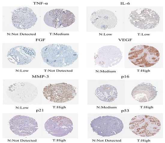 The GSE20685 dataset was downloaded through the GEO database. A total of 327 patients with BRCA were included. The GSE20685 dataset was employed as an external validation set. We performed batch-to-batch correction of gene expression values between the GSE20685 cohort and the TCGA-BRCA cohort to eliminate batch differences with the ComBat function and the R “sva” package []. Afterward, the GSE20685 cohort was also split into the two different risk subgroups on the basis of risk cutoff values in the training cohort. The Kaplan–Meier survival curve was also drawn to assess differences of OS in the two different risk subgroups. The ROC curve assessed the ability to predict prognosis in the GSE20685 cohort. Afterwards, protein expression levels of aging-related markers (including p21, p16, p53, TNF-α, IL-6, FGF, VEGF, and MMP-3) were compared between BC and common samples from the Human Protein Atlas (HPA) database (https://www.proteinatlas.org/, accessed on 13 January 2023) (Knut and Alice Wallenberg Foundation) [].