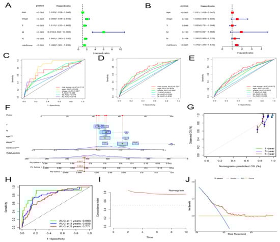 Construction and validation of a clinical prognostic nomogram for survival prediction. (A) Results of the univariate Cox regression analyses. (B) Results of the multivariate Cox regression analyses. (C–E) 1-, 3-, and 5-year ROC analyses of risk scores and clinical features. (F) The nomogram is based on the TCGA-BRCA cohort. (G) Calibration curves of the nomogram. (H) Time-dependent ROC curves and AUC analyses. (I) Concordance index (C-index) of the nomogram. (J) Decision curve analyses (DCA) comparing the predictive capacities.