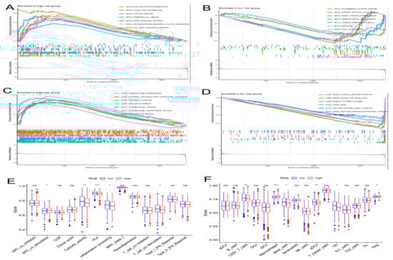 The gene set enrichment analysis (GSEA) and immune function between the high- and low-risk groups. The GSEA method was performed to identify and visualize the differential Kyoto Encyclopedia of Genes and Genomes (KEGG) (A,B) and Gene Ontology (GO) (C,D) enrichment analyses in the high- and low-risk groups. (E) Results of immune functions. (F) Results of infiltrating fractions of immune cells. * p < 0.05, ** p < 0.01, *** p < 0.001, ns (no significance).