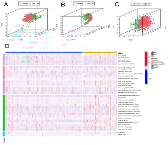 Principal component analysis (PCA) and correlation of risk scores with immune cell infiltration in different immune databases. PCA of low-risk and high-risk groups based on whole-genome (A), aging-related lncRNAs (B), and the risk signature including six aging-related lncRNAs (C). Patients with high risk scores are represented by red dots, patients with low risk scores are indicated by green dots. (D) The heatmap shows the correlation of risk scores with immune cell infiltration in different immune databases.