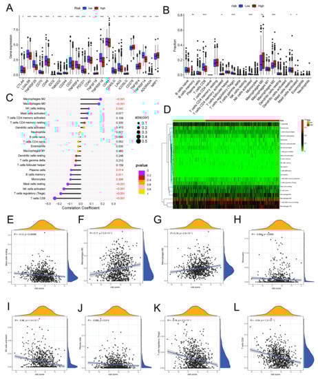 Expression of immune checkpoint molecules and the relationship between risk scores and immune cell infiltration in two different risk groups. (A) The distribution of immune checkpoints was significantly different between the high- and low-risk groups as determined by Wilcoxon test. (B) Differential analyses of the proportion of immune cell infiltration. Lollipop chart (C) and heatmap (D) showing correlation between risk scores and immune cell infiltration by Spearman rank correlation test. (E–L) Estimation of risk score coefficients for 8 types of immune cells using Spearman rank correlation test. * p < 0.05, ** p < 0.01, *** p < 0.001.