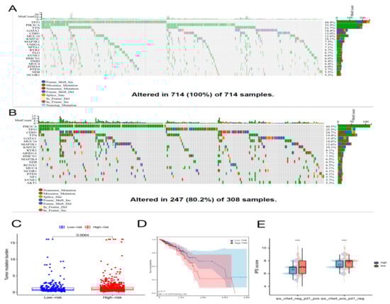 The mutation profile, tumor mutational burden (TMB), and immunophenoscore (IPS) in high-risk and low-risk groups. Mutation profile of BC patients in high-risk group (A) and in low-risk group (B). (C) The difference of TMB between two different risk groups as determined by the Wilcoxon test. (D) The relationship between TMB and overall survival of BC patients using the log-rank test. (E) Results of IPS in high-risk and low-risk groups using the Wilcoxon test, *** p < 0.001.