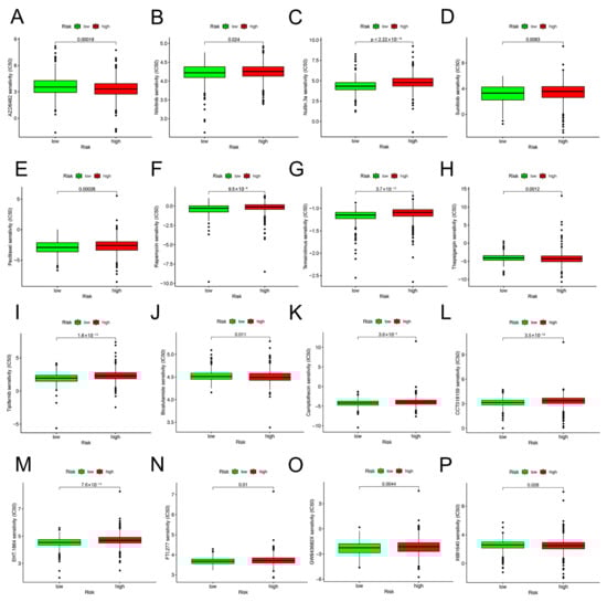 Drug sensitivity predictions as determined by the pRRophetic algorithm in R using the Wilcoxon test. (A–P) Different drug sensitivities associated with 6-ARlncRNAs signature.