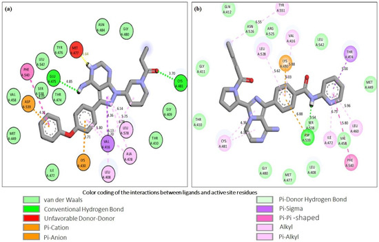 Molecular interaction analysis of the control inhibitors, ibrutinib and acalabrutinib upon docking with BTK. The figure shows the respective two-dimensional illustrations of the interaction of Ibrutinib (a) and Acalabrutinib (b) with specific amino acid residues in the active site of BTK. The interactions of the control inhibitors with the active site residues of BTK are represented as dotted lines of various colors and their corresponding bond distances are also shown in the figure. The color coding of the interactions is provided at the bottom of the figure.