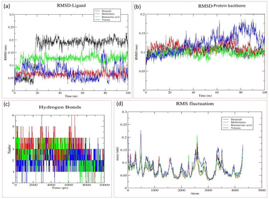 Molecular dynamics (MD) analysis of the docking complexes of the best three phytochemicals (Molludistin, rosmarinic acid, and Vitexin) and the control drug (Ibrutinib). (a) RMSD of different ligands in the binding pocket of Bruton’s tyrosine kinase (BTK), (b) RMSD of the protein (BTK) backbone, (c) Hydrogen bond plots of the different ligands with BTK, and (d) RMSF of the atoms of BTK backbone when bound with different ligands. The ligands, their corresponding protein backbones, and their hydrogen bond pattern are uniformly color coded in the figure (Ibrutinib, in black; Molludistin, in red; rosmarinic acid, in green; and Vitexin, in blue).