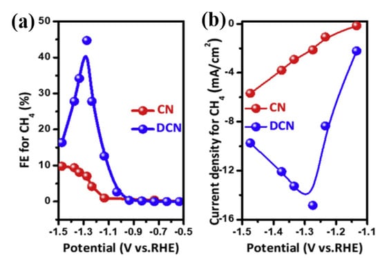 | DCN | CH4 | 44% | −1.27 | 0.5 M KHCO3 | 14.8 | [44] |