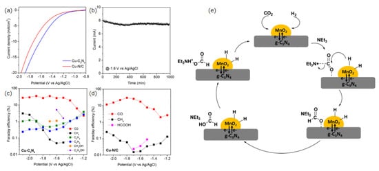 | Cu-g-C3N4/MoS2 | CH3OH | 19.70% | −0.67 | 0.5 M KHCO3 | 78 | [102] |