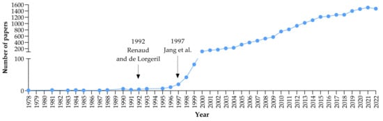 Resveratrol-related papers published in Pubmed.gov from 1978 to 2022, with significant acceleration visible after 1992 Renaud and de Lorgeril [3] and 1997—Jang et al. [16].