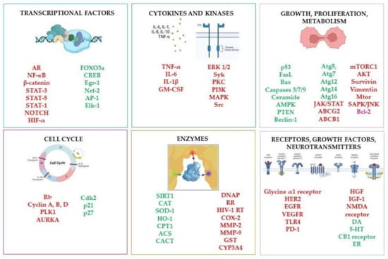 The selected molecular targets of resveratrol. The activated targets are marked in green, while the inhibited ones are in red. Created with BioRender.com. Abbreviations: AR—androgen receptor; ABCB1—ATP Binding Cassette Subfamily B Member 1; ABCG2—ATP Binding Cassette Subfamily G Member 2; ACS—Acetyl-CoA synthetase; AKT—Protein kinase B, serine/threonine-specific protein kinase; AMPK—AMP-activated protein kinase; AP-1—Activator Protein 1; Atg—anti-thymocyte globulin; AURKA—Aurora kinase A; Bax—Bcl-2-associated X protein; Blc-2—B-cell lymphoma 2; CACT—Carnitine-acylcarnitine translocase; CAT—Catalase; CB-1 receptor—Cannabinoid receptor type 1; Cdk2—Cyclin dependent kinase 2; COX-2—Cyclo-oxygenase 2; CPT-1—Carnitine palmitoyltransferase 1; CREB—cAMP-Response Element Binding protein; CYP3A4—Cytochrome P450 3A4; DA—Dopamine; DNAP—DNA polymerase; EGFR—Epidermal Growth Factor Receptor; Elk-1—ETS (E twenty-six) Like-1 protein; ER—Estrogen receptor ERK1/2—Mitogen-activated protein (MAP) kinase 1/2; FasL—Fas ligand; FOXO3a—Forkhead Box Protein O3a; GM-CSF—Granulocyte Macrophage Colony-Stimulating Factor; GST—Glutathione S-Transferase; HER2—human epidermal growth factor receptor 2; HGF—Hepatocyte growth factor; HIF-α—Hypoxia-Inducible Factor α; HIV-1 RT—HIV-1 reverse transcriptase; HO-1—Heme oxygenase-1; IGF-1—Insulin-like Growth Factor 1; IL-1β—Interleukin 1β; IL-6—Interleukin 6; JAK/STAT—Janus kinase-signal transducer and activator of transcription pathway; MAPK—Mitogen-Activated Protein Kinase; MMP-2—matrix metallopeptidase 2; MMP-9—matrix metallopeptidase 9; mTOR—Mammalian Target of Rapamycin; mTORC1—mammalian target of rapamycin complex 1; NFκB—Nuclear factor-kappa B; NMDA receptor—N-methyl-D-aspartate receptor; NOTCH—Notch signalling pathway receptor family; Nrf-2—Nuclear factor erythroid 2-related factor 2; p21—cyclin-dependent kinase inhibitor 1; p27—Cyclin-dependent kinase inhibitor 1B; p53—Tumor protein P53; PD-1—Programmed cell death 1 receptor; PI3K—Phosphoinositide 3-Kinase; PKC—Protein kinase C; PLK1—Polo-like kinase 1; PTEN—Phosphatase and tensin homolog deleted on chromosome 10; Rb—Retinoblastoma protein; RR—Ribonucleotide reductase; SAPK/JNK—stress-activated protein kinase/Jun N-terminal kinase; SIRT1—Sirtuin; SOD-1—Superoxide dismutase; Src—Non-Receptor Tyrosine Kinase; STAT—Signal Transducer and Activators of Transcription protein family; Syk—Spleen Associated Tyrosine Kinase; TLR4—Toll Like Receptor 4; TNF-α—Tumour Necrosis Factor α; VEGFR—Vascular Endothelial Growth Factor Receptor; 5-HT—Serotonine.