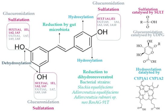 Main targets for drug-metabolizing enzymes in resveratrol molecule [28,60,65,66,68,69].