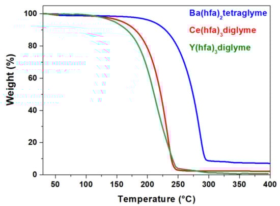 TGA profiles of Ba(hfa)2tetraglyme, Ce(hfa)3diglyme and Y(hfa)3diglyme under N2 flow at atmospheric pressure, in the temperature range 25–400 °C.
