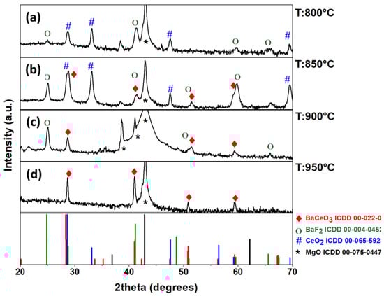 Structural characterization through XRD analyses displays the formation of different crystalline phases, depending on the deposition temperature. Figure 2 reports the patterns recorded for different samples deposited on MgO (100) substrates as a function of the deposition temperatures. At a lower temperature, i.e., 800 °C and 850 °C (Figure 2a,b), a mixture of different phases has been detected. In particular, peaks associated with the CeO2 and BaF2 have been found under both deposition temperatures. Furthermore, the presence of certain peaks (shown in red in the Figure 2b) suggests the formation of a slight amount of the BaCeO3 phase. However, the detection of this phase cannot be attributed univocally. At a higher temperature of 900 °C (Figure 2c) instead, the formation of the BaCeO3 phase has been confirmed by the peaks at 28.70°, 50.92° and 59.24°, related to the 002, 213/231 and 004/422 reflections, respectively. Under these conditions, however, impurities of BaF2 have been found as well. The peaks at 38.64° and 41.06° are related to 200 reflection of the MgO (100) substrate arisen from the diffraction of the Cu Kβ and W Lα1 line, respectively. Lastly, the film obtained at 950 °C presents only peaks associated with the formation of pure and polycrystalline BaCeO3 perovskite phase at 28.66°, 40.98°, 50.86° and 59.40°, which correspond to the 002, 022/400, 213/231 and 004/422 reflections (Figure 2d) (International Centre Diffraction Data (ICDD) no. 00-022-0074). The presence of peaks due to differently oriented grains indicate the formation of polycrystalline films with a random grain growth.
