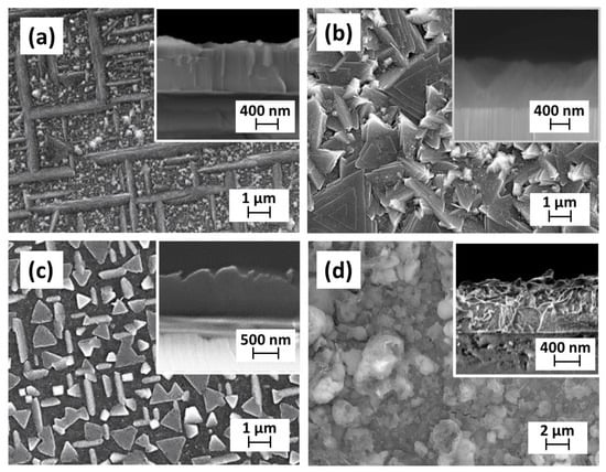 As a consequence, the differences in phase composition are also reflected in the morphology of the layers, as observed through the FE-SEM characterization. In Figure 3a, the film obtained at 800 °C shows the formation of a nanostructured layer, with grains of hundreds of nanometres uniformly distributed between ordered rod/plate-like grains of a few microns. The film thickness of about 875 ± 25 nm is visible in the inset of Figure 3a. The sample obtained at 850 °C, reported in Figure 3b, presents a surface characterized by irregular grains, in which several triangular-shaped grains of the order of microns are observed. In particular, these triangular spiral nanoplates are indicative of a spiral-like growth [], probably associated with the CeO2 growth and in accordance with the intense CeO2 111 reflection observed at 28.85° in the related pattern. This quite peculiar morphology is also visible in the cross section (inset of Figure 3b), where a thickness ranging from 700 to 930 nm can be considered. Smaller and uniformly distributed triangular grains are instead displayed in Figure 3c for the sample obtained at 900 °C.