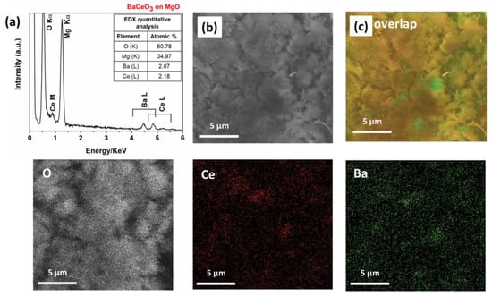 Moreover, the homogeneity of the film has been assessed through EDX maps on the pure BaCeO3 films deposited on the MgO substrate (Figure 4b,c). For this aim, a large area has been analyzed in order to confirm the homogeneity of the systems. In Figure 4b, the colored maps of Ba, Ce and O elements have been reported. The maps indicate a uniform distribution of the elements in the BaCeO3 layer, as confirmed in the overlapped image (Figure 4c).