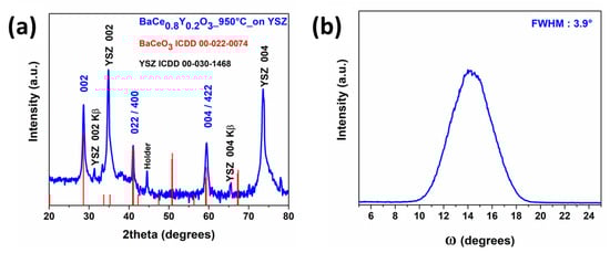(a) XRD pattern and (b) rocking curve of the 002 reflection of Y-doped BaCeO3 thin film grown on the YSZ (100) substrate at a deposition temperature of 950 °C.