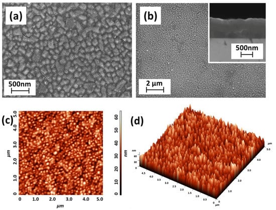 Structural characterization was performed using a Smartlab diffractometer (Rigaku, Tokyo, Japan), in the Bragg–Brentano mode operating at 45 kV and 200 mA, equipped with a rotating anode of Cu Kα radiation. The patterns were recorded in the range of 20–70°, using a step of 0.02°. Film morphologies were investigated through field emission scanning electron microscopy (FE-SEM) ZEISS SUPRA 55 VP (ZEISS, Jena, Germany). The films were Au-coated before the FE-SEM characterizations. All the FE-SEM images were recorded using a beam energy of 15 keV and a working distance of about 3.5 mm, using the in-lens secondary electron detector. Several regions were investigated in order to assess the uniformity of the film morphologies. The atomic composition of the samples was determined by performing energy dispersive X-ray (EDX) analysis, using an INCA-Oxford windowless detector (Oxford Instruments, Abingdon, UK), with a resolution of 127 eV as the FWHM of Mn Kα. For each sample, three different regions were analysed to confirm the compositional homogeneity. The AFM images were obtained in the contact mode. Before and after each measurement the noise level was 0.01 nm. Several regions were analyzed in order to obtain the most representative region of each sample and an accurate value of the root mean square (RMS) roughness.