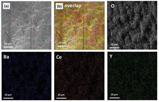 In Figure 9, the relative maps present an even distribution of the Ba, Ce and O elements, and the Y dopant is also homogenously distributed all over the Y-doped BaCeO3 thin film (Figure 9b). This evidence is an important aspect to assess the suitability of the reported process for the formation of doped BaCeO3 systems over large areas. In fact, the uniform distribution of the doping ion is of paramount importance for the final functional properties of the material.