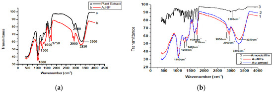 FT-IR studies were performed to identify possible entities involved in the reduction, stabilization, and capping of AuNPs. A comparison of FT-IR spectra of prepared Micromeria biflora flavonoid extract and AuNPs was performed. In (Figure 2a) (curve a), plant material shows a high intensity band at 3200 cm−1, indicating (–OH stretching) of alcohol, phenol, or carboxylic acid of flavonoids responsible for the reduction of gold ions. A band of low intensity at 2850 cm−1 shows (–CH2) groups. Similarly, a band at 1600 cm−1 for C=O stretching. A weak band at 1200 cm−1 indicates the C-O stretching of esters, cyclic ethers, alcohols, or carboxylic acids. In (curve b), (Figure 2a) shows the possible involvement of all these functional groups during formation, stabilization, and capping of AuNPs by shifting all these band slightly. Similarly, the FT-IR spectra (Figure 2b) of AuNPs and Au-amoxi conjugate (curve 2) show slight shifting of IR bands, indicating the conjugation has taken place and amoxicillin has linked to the surface of AuNPs through van der Waal interactions of NH2 S, OH, or carboxylic acid groups present in the amoxicillin. A wide band at 3100 cm−1 in amoxicillin spectrum (curve 3) shows the presence of hydrogen-bonded OH or NH2 group, while during conjugation, this band is more sharper and appears at 3300 cm−1. A lot of changes have been observed from 400 cm−1 to 2000 cm−1 in amoxicillin spectra when conjugated with AuNPs. The comparison between IR spectra of AuNPs (curve 1) and Au-amoxi (curve 2) reveals the absorption of OH or NH2 group is slightly shifted from 3250 cm−1 to 3300 cm−1, while peaks at 1750 cm−1 shift to 1600 cm−1, which is equally supported by the presence of a peak at 1250 cm−1, which may be due to in-plane bending of OH group or due to the presence of C-N stretching. The band at 1750 cm−1 in AuNPs indicates the presence of a carbonyl stretching which is equally supported by a band near 1150 cm−1 of C-O starching.