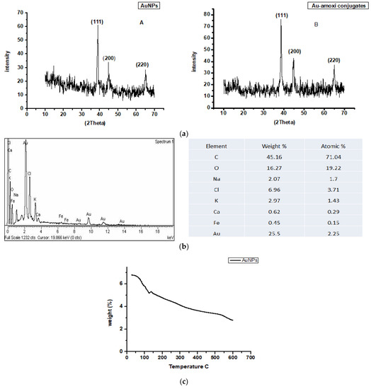 XRD analysis is a method that is use to find the size and crystalline nature of the samples. XRD of AuNPs (Figure 4a) showed three distinctive diffraction peaks in the 2θ range of 10°–70° at 38.2°, 44.3°, and 64.6°, respectively, which indexed the planes (111), (200), and (220) of the cubic-face-centered gold. The cubic-face-centered structures of gold matched those in the database of the Joint Committee on Powder Diffraction Standards, USA (JCPDS no. 96-900-8464) [36]. The size of the AuNPs and Au-amoxi conjugate was calculated using “Scherrer” equation which shows that the size of AuNPs is around 35 nm, while that of Au-amoxi conjugate is around 49 nm, which is quite consistent with other characterization techniques. Similarly, elemental analysis (EDX) of AuNPs shows the formation of NPs and its conjugate (Figure 4b).
