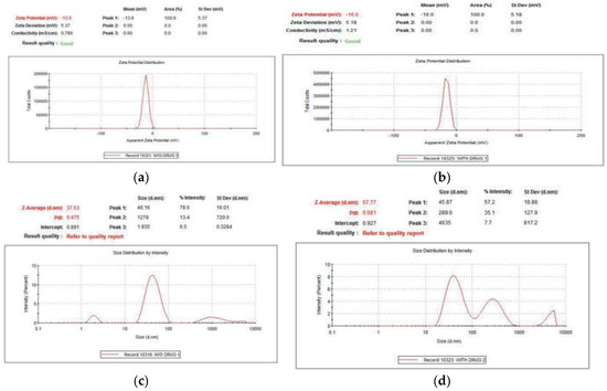 Colloidal solutions with zeta potential (ZP) values ranging between ±30 mV are highly stable [37]. The present study results reveal that the ZP of AuNPs is −13.6 mV with a standard deviation of 5.37 mV and that of Au-amoxi is −16.0 mV with standard deviation of 5.18 and are fairly stable according to the reported literature [38]. The ZP value was found to fall in the negative side, i.e., −16 for Au–amoxi, which showed the effectiveness of the amoxicillin molecules as a capping agent by providing an extensive negative charge and thus preventing agglomeration [39]. The particle size distribution of AuNPs with a z- average of 37.57 nm and pdi of 0.475 suggests the polydispersity of the sample. Similarly, the z-average of Au–amoxi is 57.77 nm with a pdi of 0.681, indicating that Au–amoxi has more size distribution compare to AuNPs. The results indicate that the average size of Au–amoxi is more than AuNPs; this may be due to the replacement of some of the phytochemicals with amoxicillin molecules resulting in an increase in size of Au–-amoxi. This is equally supported by the UV–vis and SEM results (Figure 5a–d).