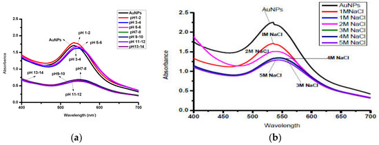 The pH was adjusted to 2–14 using 1 M HCl and NaOH, respectively. AuNPs are found to be stable at acidic pH (5–6) and less stable under strongly basic conditions (Figure 6a). Aggregation of NPs begins when the pH changes from acidic to basic. The effect of different concentrations of NaCl 1–5 M (Figure 6b) shows that the absorption of AuNPs shifts towards longer wavelengths with increasing concentrations of NaCl, sug–gesting the change in shape and size of NPs with changing electrolyte concentrations.