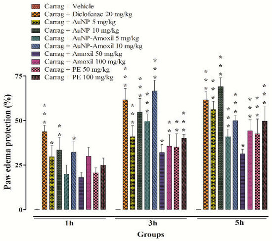 The anti-inflammatory activity was performed according to reported protocol [52,53]. The animals were divided into six sets, and each set included six animals. SET I animals received a single dose of vehicle (3% DMSO, 1% Tween-80, and 96% physiological saline) combined with carrageenan as a negative control. SET II animals received diclofenac (50 mg/kg) as a positive control, while other SETs (III-VI) received doses of AuNPs and Au-amoxi conjugate (5 mg/kg and 10 mg/kg), amoxicillin (50 mg/kg and 100 mg/kg), and plant extract (P.E) (50 mg/kg and 100 mg/kg), respectively. Animals were injected with carrageenan (0.05 mL; 1%) solution via the subplantar area of the left hind paw, and after 60 min of treatment, the paw volume was measured using a digital plethysmometer (Plan lab, Spain) at different time intervals (1 h, 3 h, and 5 h). Percentage inhibition was measured using Equation (1).