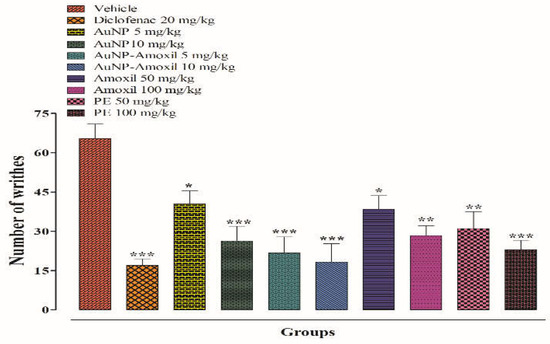 Albino mice of both sexes weighing 18–22 g were used in this study. All animals were fasted for 2 h before testing. Animals were divided into six groups (n = 6). As a control, group I received an intraperitoneal injection of vehicle, while group II received standard diclofenac sodium (20 mg/kg body weight), and the other groups received AuNP and Au-amoxi (5 and 10 mg/kg, i.p), amoxicillin (50 and 100 mg/kg, i.p), and P.E (50 and 100 mg/kg, i.p). After 30 min, the animals were injected with 1% acetic acid intravenously. After 5 min of acetic acid administration, the writhing was counted. For 20 min, the number of abdominal contractions (writhes) was counted (Figure 3). The percent antinociceptive effect was calculated from the number of writhes as