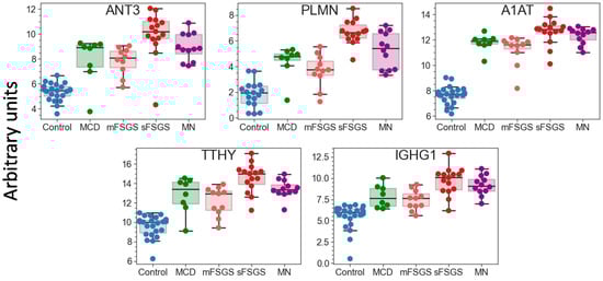 Boxplots for 5 urinary proteins that revealed the greatest number of differences between the control and glomerulopathy groups at FDR < 0.01 (Benjamini–Hochberg). The protein levels are shown in arbitrary units on an Ln(x + 1) scale. Abbreviations: ANT3—antithrombin-III; PLMN—plasminogen; A1AT—alpha-1-antichymotrypsin; TTHY—transthyretin; IGHG1—Ig gamma-1 chain C region.
