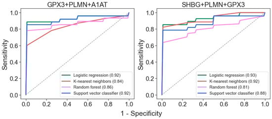 Binary classifiers built using four machine learning algorithms suggest that the best ROC-AUC metrics can be achieved even with just three proteins: GPX3, PLMN, and A1AT or SHBG (Figure 4). Both of these three-protein sets may be highly effective for distinguishing samples from patients with mild and severe disease states.