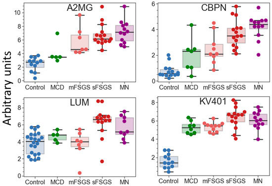 Boxplots for some of the potential protein markers prevalent only in certain glomerulopathies. The protein levels are presented in arbitrary units on an Ln(x + 1) scale. Abbreviations: A2MG—alpha-2-macroglobulin; CBPN—carboxypeptidase N catalytic chain; KV401—immunoglobulin kappa variable 4-1; LUM—lumican.