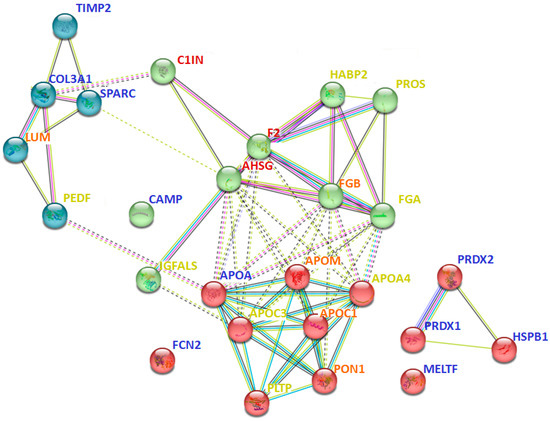 Interaction analysis of some of the potential urinary protein markers prevalent only in certain groups (Table 2), using the STRING method. The red cluster corresponds to different processes associated with lipid metabolism; the green cluster relates to immune processes; the blue cluster corresponds to extracellular matrix organization. The color of the font indicates the predominance of the protein in specific groups: blue—control; yellow—sFSGS; orange—sFSGS and MN; red—MCD, mFSGS, sFSGS, and MN. Abbreviations coincide with the data in Table 2. The more complete information for all prevailing proteins is given in Supplementary Table S5.